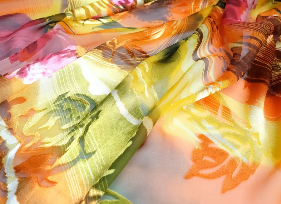 Ткань атлас-шифон с принтом розы крупные оранжевый ш 1,1 (шелк 100%)